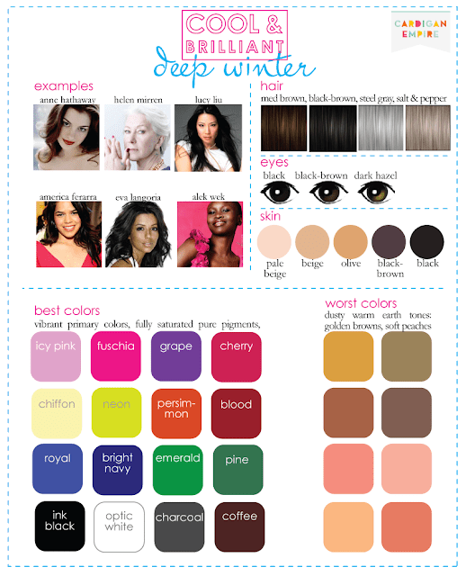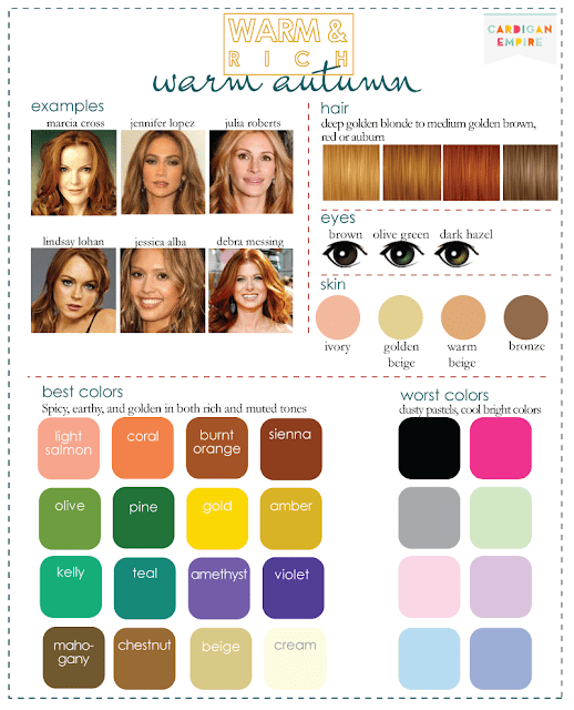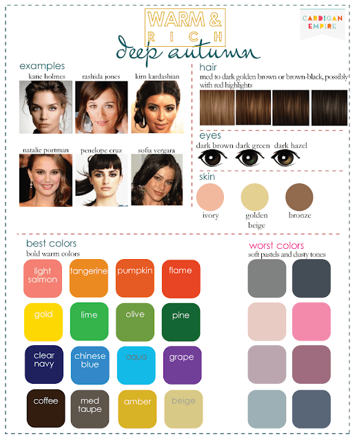 There are also tips & tricks to changing your color palette. For example, my skin tone and eye color matches my palette (deep autumn) but it also matches Clear Spring. If I dyed my hair, those colors would match me better.