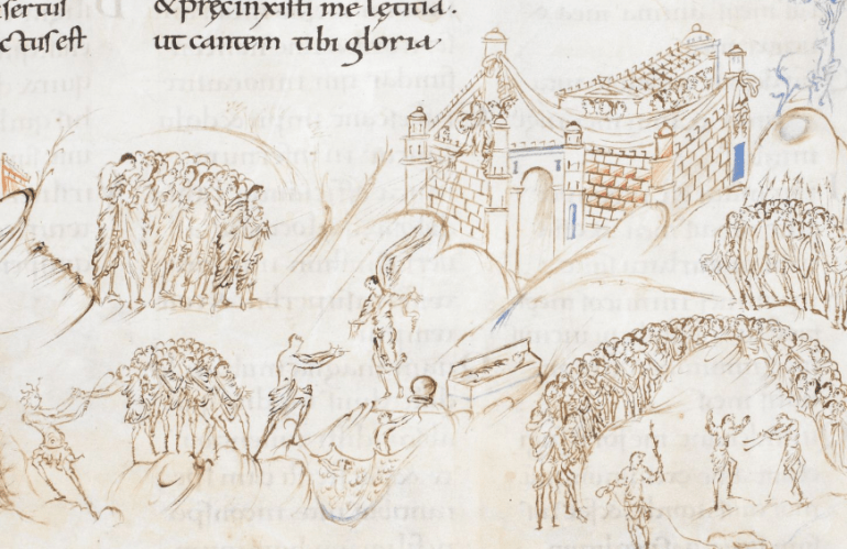 In the 11th century, an unknown medieval writer, probably a monk or nun, copied and illustrated a document that we call the Harley Psalter. What’s amazing about this work is that for all 143 psalms… (it is incomplete)… there’s at least one illustration, sketched plainly in brown ink. It’s not the sort of thing you would expect from a medieval psalter, most of which are illuminated in bright colors. But sometimes these simple illustrations are incredibly profound.